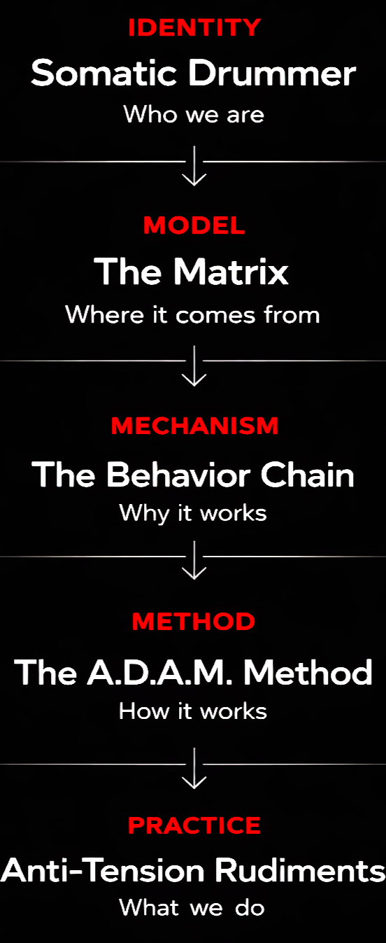 The Somatic Drummer Matrix maps this behavior so that the method can reshape it.